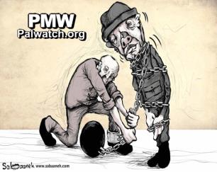 The cartoon shows a Palestinian prisoner using the ball and chain around his leg to tie up what appears to be an Israeli jailer, who is depicted with grotesque facial features resembling a pig.
