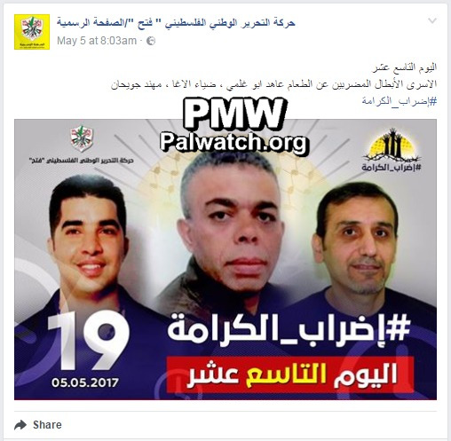 The hunger striking heroic prisoners Ahed Abu Gholmeh (i.e., terrorist, planned murder of Israeli minister), Diya Al-Agha (i.e., terrorist, murdered 1), and Muhannad Jweihan (i.e., terrorist, involved in murder of 1)