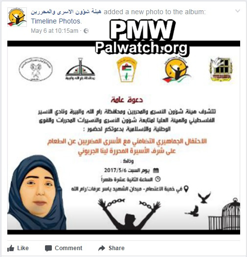 PLO Prisoners’ Affairs Commission invites Palestinians to celebrate release of convicted female terrorist