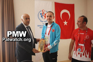 One of the images shows Fatah Central Committee Secretary Jibril Rajoub presenting a Turkish representative with a plaque of honor in the shape of the PA map of “Palestine” that presents all of Israel as “Palestine” together with the PA areas.