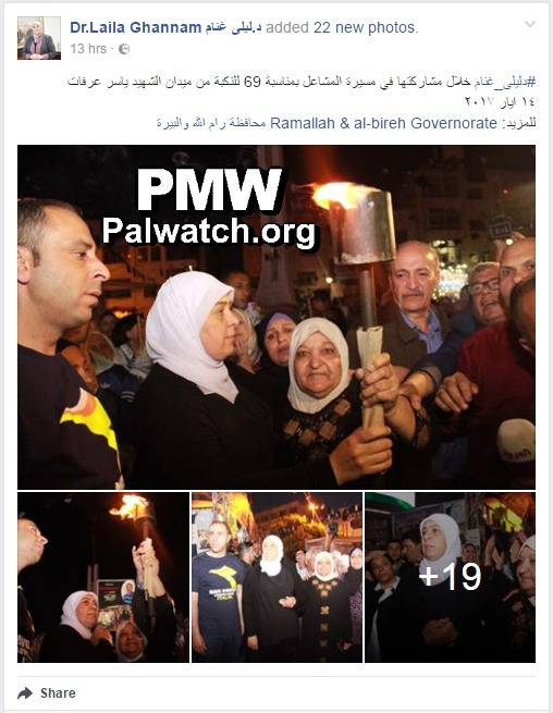 Posted text: “[District Governor of Ramallah and El-Bireh] Laila Ghannam while participating in the procession of torches for the 69th [anniversary] of the Nakba (i.e., “the catastrophe,” the Palestinian term for the establishment of the State of Israel) from Martyr (Shahid) Yasser Arafat Square, May 13, 2017”
