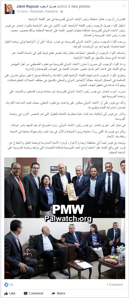 Posted text: “[Fatah Central Committee Secretary and Chairman of the Palestine Olympic Committee] Jibril Rajoub during the reception of International Federation for Equestrian Sports President [Ingmar De Vos] at the [Palestine] Olympic Committee headquarters.”