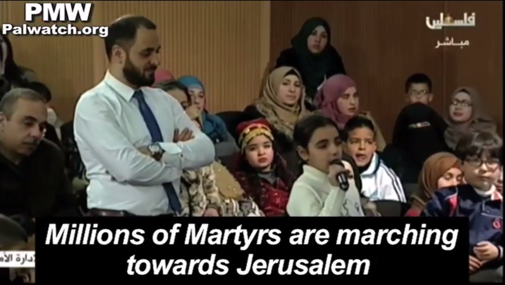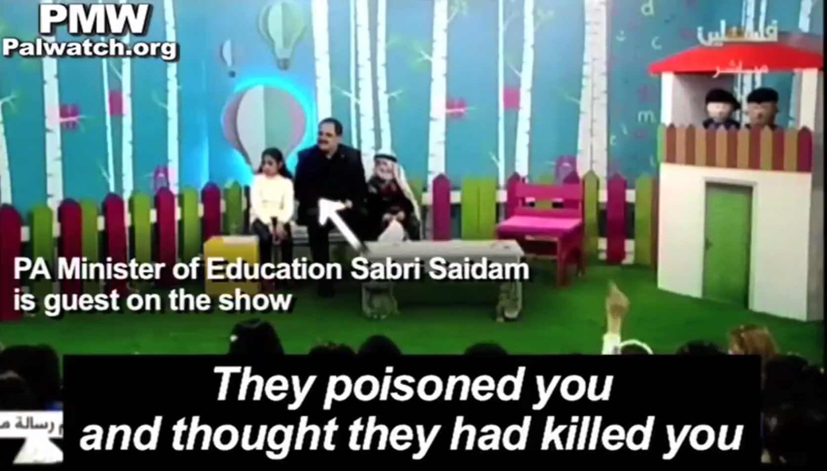 The spreading of this libel has become so successful that even children reiterate it. In an episode of official PA TV's children's program The Best Home, a girl repeated the libel in a poem she had written, while the show's guest PA Minister of Education Sabri Saidam listened: