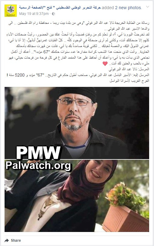 Fatah posts praise for bomb maker, daughter of imprisoned Abdallah Barghouti: You have “given this people dignity.”