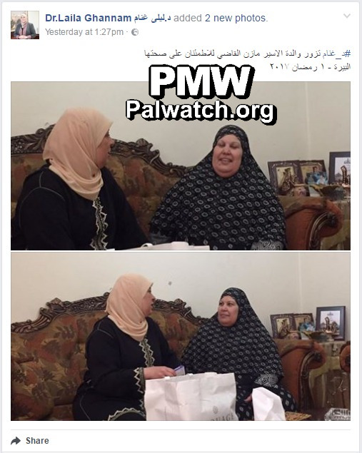 Posted text: "[District Governor of Ramallah and El-Bireh] #Dr._[Laila_]Ghannam visits the mother of prisoner Mazen Al-Qadi (i.e., terrorist, involved in murder of 3) in order to be updated regarding the state of his health