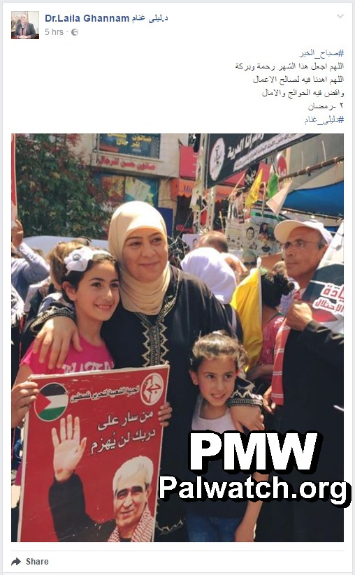 The image shows District Governor of Ramallah and El-Bireh Laila Ghannam embracing a girl who is holding a poster showing prisoner Ahmad Sa’adat, head of the Popular Front for the Liberation of Palestine (PFLP) terror organization. The top right of the poster shows the PFLP logo and the top left features a Palestinian flag.