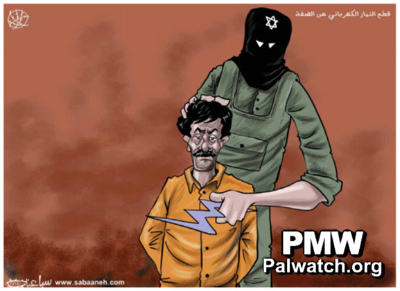 This cartoon also appeared in the PA daily on Feb. 25, 2015, in reference to Israel cutting off electricity to two Palestinian towns for a limited time in order to pressure the PA to pay part of its billion shekel debt to Israel for electricity.
