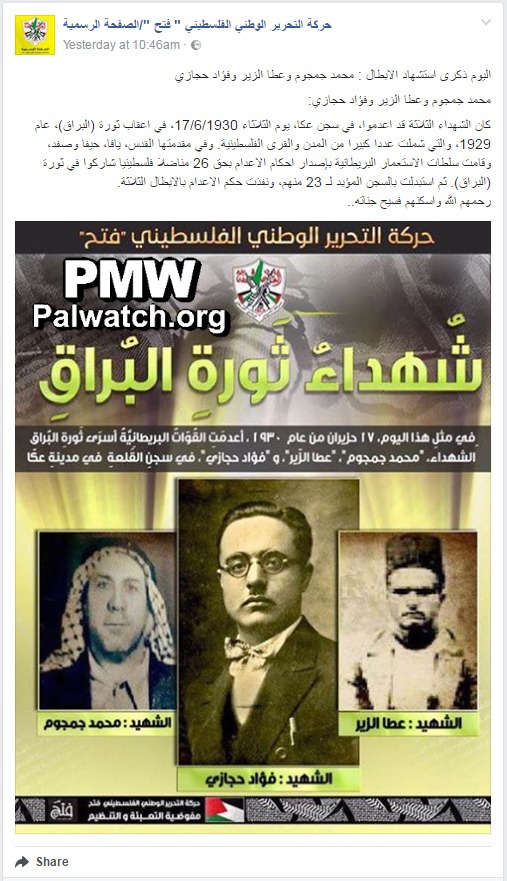 Fatah: 3 murderers of Jews in 1929 Hebron riots are “heroes”