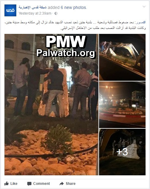“The Jenin Municipality on Saturday morning [June 24, 2017] reinstated the Martyr (Shahid) Khaled Nazzal monument (i.e., terrorist, responsible for murder of 31) to Haifa Street in the center of the city, and this was after it was destroyed two days ago.