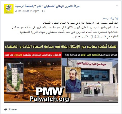 Fatah on Israel’s removal of terrorist monument, Hamas’ change of school name: Hamas and Israel work for same goal, erasing Palestinian memory