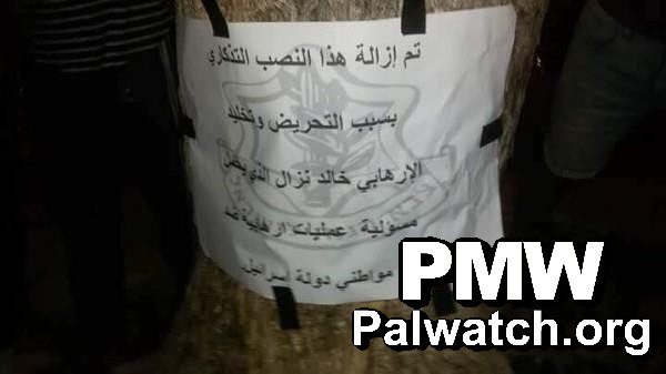 Text on notice: “This monument was removed due to the incitement and memorialization of terrorist Khaled Nazzal, who was responsible for terror attacks against citizens of the State of Israel”