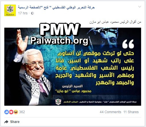 The image shows a picture of PA Chairman Mahmoud Abbas with the text: “‘Even if I will have to leave my position, I will not compromise on the salary (rawatib) of a Martyr (Shahid) or a prisoner, as I am the president of the entire Palestinian people, including the prisoners, the Martyrs, the injured, the expelled, and the uprooted.’