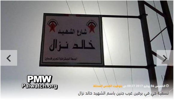 “The Burqin Municipality, southwest of Jenin, named one of the town’s streets after Martyr (Shahid) Khaled Nazzal (i.e., terrorist, responsible for murder of 31) today [July 6, 2017].