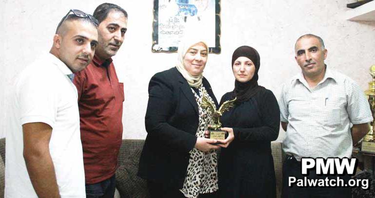 The article includes a picture of Ramallah and El-Bireh District Governor Laila Ghannam presenting a statuette of a bird to the family of terrorist Muhammad Hattab.