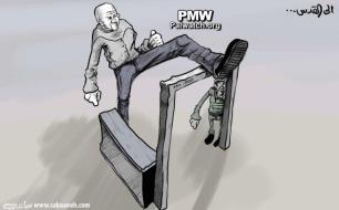Palestinian Authority official daily cartoon shows Palestinian “giant” stepping over Israeli metal detectors