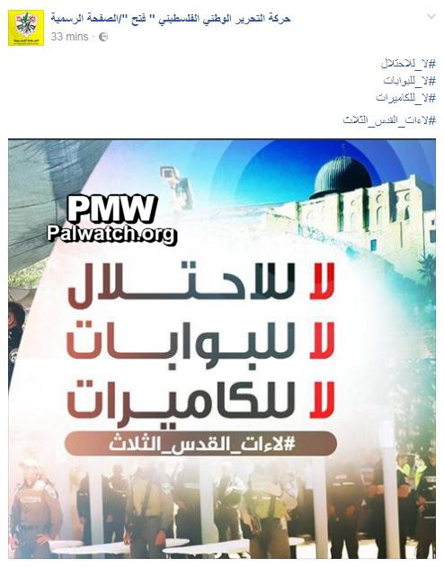 Image and text posted on the official Fatah Facebook pageThe image shows security cameras. Israel placed metal detectors and security cameras at the entrances to the Temple Mount following the terror attack on July 14, 2017, when three terrorists shot from the Temple Mount and murdered 2 Israeli border policemen. Israel removed the metal detectors on July 24, 2017. While ignoring Israel’s reason for installing these security measures to prevent future attacks on the holy site, PA and Fatah leaders have presented this step as a “violation,” claiming it is "a step on the way to establishing the alleged Temple." This claim plays on the fears Palestinian leaders continuously are trying to sow among Palestinians that “the Al-Aqsa Mosque is in danger” of being destroyed by Israel.