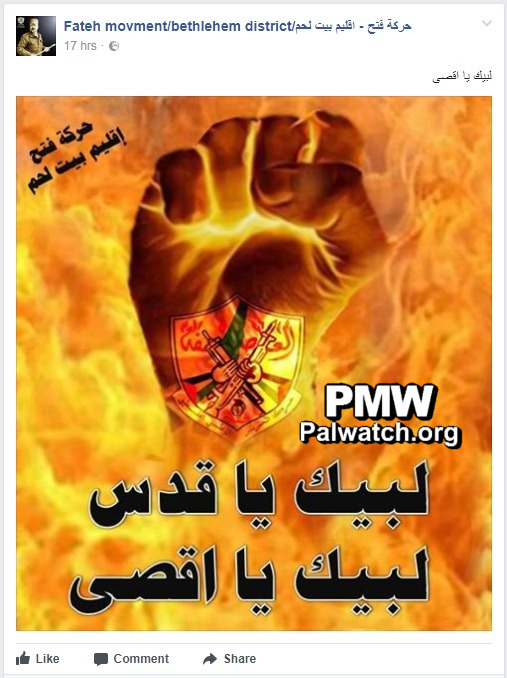 Image (above) and text posted on the Facebook page of the Fatah Movement's Bethlehem Branch:Posted text: "At your service, O Al-Aqsa Mosque"