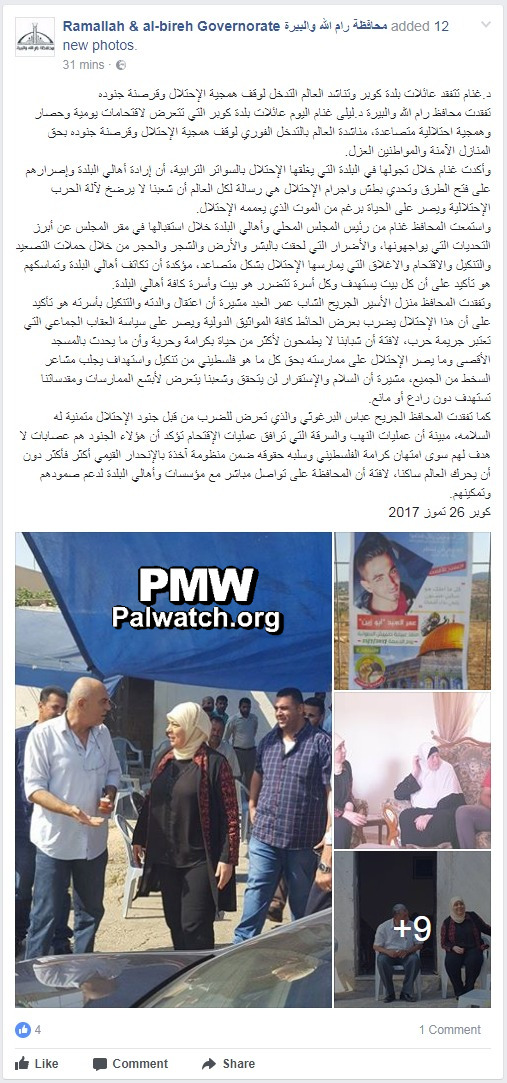 Posted text: “[District Governor of Ramallah and El-Bireh] Dr. [Laila] Ghannam visited the families of the village of Kubar and called on the world to intervene to stop the occupation’s aggression and the acts of piracy of its soldiersDistrict Governor of Ramallah and El-Bireh Dr. Laila Ghannam today [July 26, 2017] visited the families of the village of Kubar who are subjected to daily raids, a siege, and intensifying aggression from the occupation. She called on the world to intervene immediately to stop the occupation’s aggression and the acts of piracy of its soldiers against the peaceful homes and unarmed civilians…