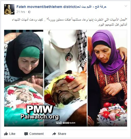 Posted text: “‛The prettiest mothers are those who have seen their son return as a Martyr (Shahid) and cried two rose tears’ (the quote is from a poem by Palestinian national poet Mahmoud Darwish –Ed.); this is how the mothers of the Martyrs said goodbye to their sons today before their funeral.”