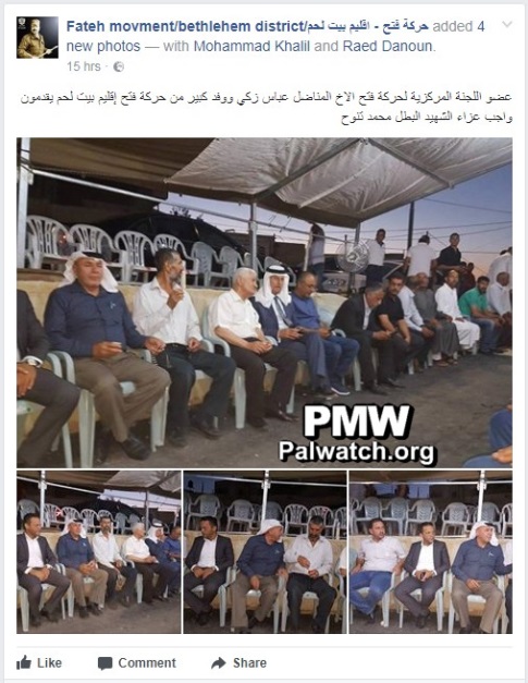 Posted text: “Fatah Movement Central Committee member [and Fatah Commissioner for Arab and China Relations] fighter Abbas Zaki and a large delegation from the Fatah Movement’s Bethlehem branch console [the family of] heroic Martyr (Shahid) Muhammad Tanouh (i.e., terrorist, tried to stab Israeli soldiers).”