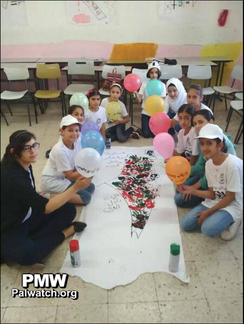 The images show a drawing of the PA map of “Palestine” that presents all of Israel as “Palestine” together with the PA areas, which the girls of the summer camp drew.