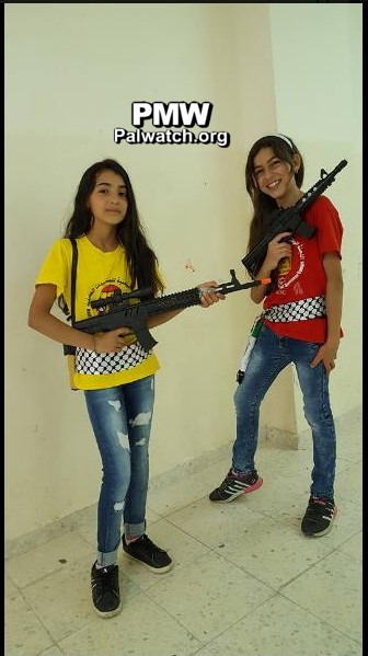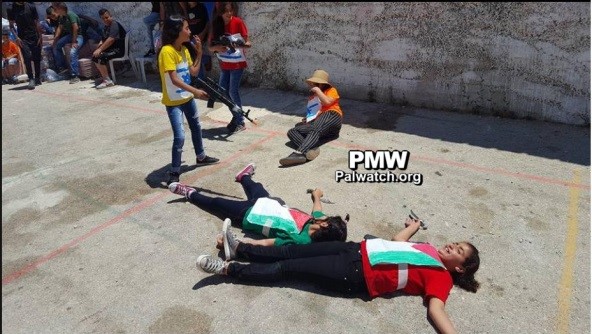 One photo shows two girls posing with toy assault rifles, while another shows a scene from a children’s play reenacting a stabbing attack. Three girls are wearing Israeli flags on their shirts, playing the role of Israelis. One is lying on the floor, presumably after being stabbed, while the other two are aiming toy assault rifles at two Palestinians wearing Palestinian flags on their shirts and who are lying “dead” as “Martyrs” on the ground with knives in their hands, “killed” by the Israelis.
