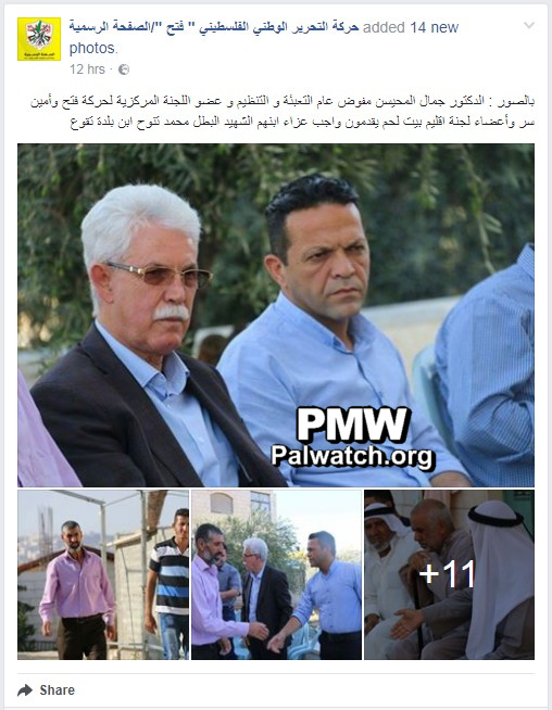 Posted text: “In the pictures: [Fatah] General Commissioner of Mobilization and Organization [in the West Bank], Fatah Movement Central Committee member, [and PLO Central Council member] Dr. Jamal Muhaisen and the secretary and members of the [Fatah] Bethlehem branch committee console [the family of] their son, heroic Martyr (Shahid) Muhammad Tanouh (i.e., terrorist, attempted to stab Israeli soldiers), a son of the village of Taqua.”