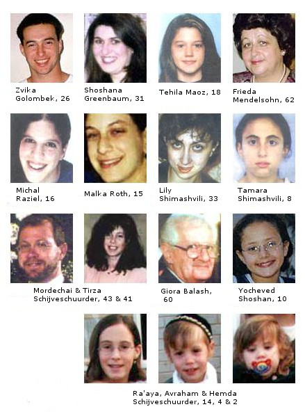 Yesterday, August 9, was the 16th anniversary of the horrific suicide bombing at the Sbarro pizza shop in Jerusalem in which 15 Israelis, among them 7 children, were murdered and 130 were wounded. Among the killed were Mordechai and Tzirel Schijveschuurder and three of their children, Ra’aya aged 14, Avraham aged 4, and Hemda aged 2.