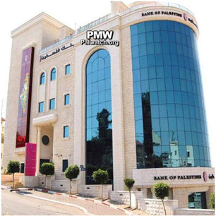 The article includes a picture of the Bank of Palestine building. On its left a large poster features the PA map of “Palestine” that presents all of Israel as “Palestine” together with the PA areas.