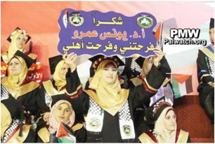 The article includes a picture from the graduation ceremony, in which a female student holds a sign with the PA map that presents all of Israel as “Palestine in the colors of the PA flag.