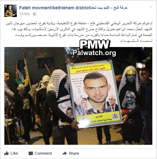 Posted text: “Fatah’s Taqua organizational branch and the Taqua Municipality invite you to participate in the rally eulogizing heroic Martyr (Shahid) Muhammad Ibrahim Jibril (i.e., terrorist who carried out car ramming attack) and unveiling the Martyr’s gravestone on the 40th day of his death as a Martyr tomorrow, Friday [Aug. 18, 2017], at 6:00 p.m. next to the Taqua High School for Girls. Your presence is a sign of loyalty to the blood of the Martyrs.”
