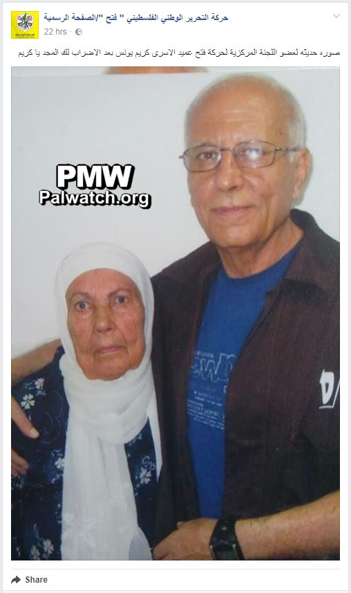 Posted text: “A recent photo of Fatah Movement Central Committee member and most veteran prisoner Karim Younes (i.e., terrorist, murdered 1) after the [hunger] strike. Praise be upon you, O Karim.”