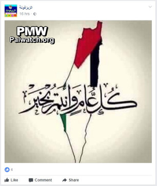 The posted image shows the PA map of "Palestine" that presents all of Israel as "Palestine" together with the PA areas. The map is painted with the colors of the Palestinian flag. Text across: “Happy New Year.”