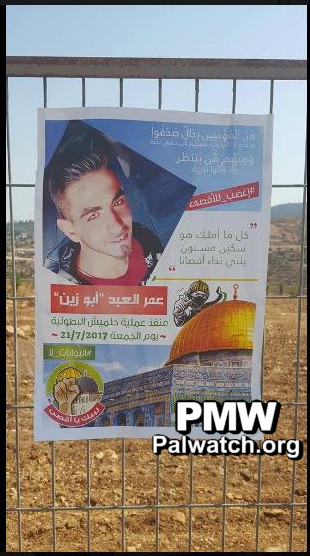 The poster glorifies Palestinian terrorist Omar Al-Abd who murdered 3 Israelis as they were having dinner in their home (rightmost photo in the top row), terrorist Muhammad Tanouh who attempted to stab Israeli soldiers (photo before last in the top row), and four Palestinian rioters who were killed by Israel during clashes following the placement of metal detectors at the entrances to the Temple Mount. (from left to right in the top row: Muhammad Lafi, Muhammad Sharaf, Muhammad Abu Ghannam, Yusuf Kashour.)