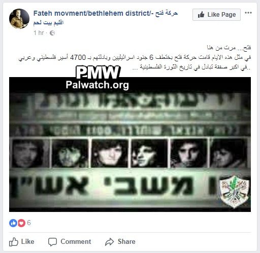 Precisely at this time [of year], the Fatah Movement kidnapped six Israeli soldiers (sic., eight were kidnapped on Sept. 4, 1982; two were transferred to the PFLP terror organization) and exchanged them for 4,700 Palestinian and Arab prisoners in the largest [prisoner] exchange deal in the history of the Palestinian revolution”