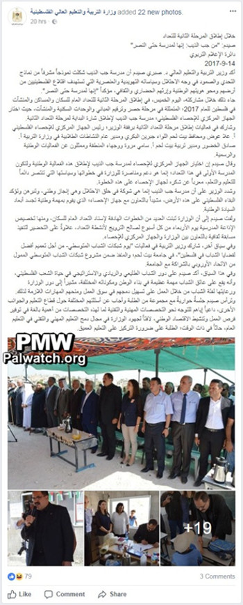 Palestinian Authority Education Minister praises school for being an “honorable example of defiance… against the occupation and its policy of Judaization" whose goal is "to erase [Palestinians’] national identity and their cultural heritage”