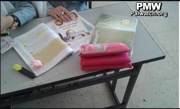 The pictures show diaries distributed by the Bethlehem Branch of the Fatah youth movement Shabiba to all of the schools in the Bethlehem district. On the front cover of the diaries is a photo of Yasser Arafat together with the logos of Fatah and the PLO which include the PA map of “Palestine” that presents all of Israel as “Palestine” together with the PA areas.