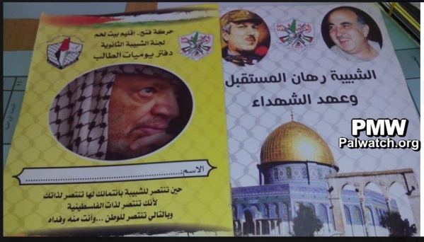 The picture shows diaries distributed by the Bethlehem Branch of the Fatah youth movement Shabiba to all of the schools in the Bethlehem district. On the front cover of the diaries is a photo of Yasser Arafat together with the logos of Fatah and the PLO which include the PA map of “Palestine” that presents all of Israel as “Palestine” together with the PA areas.