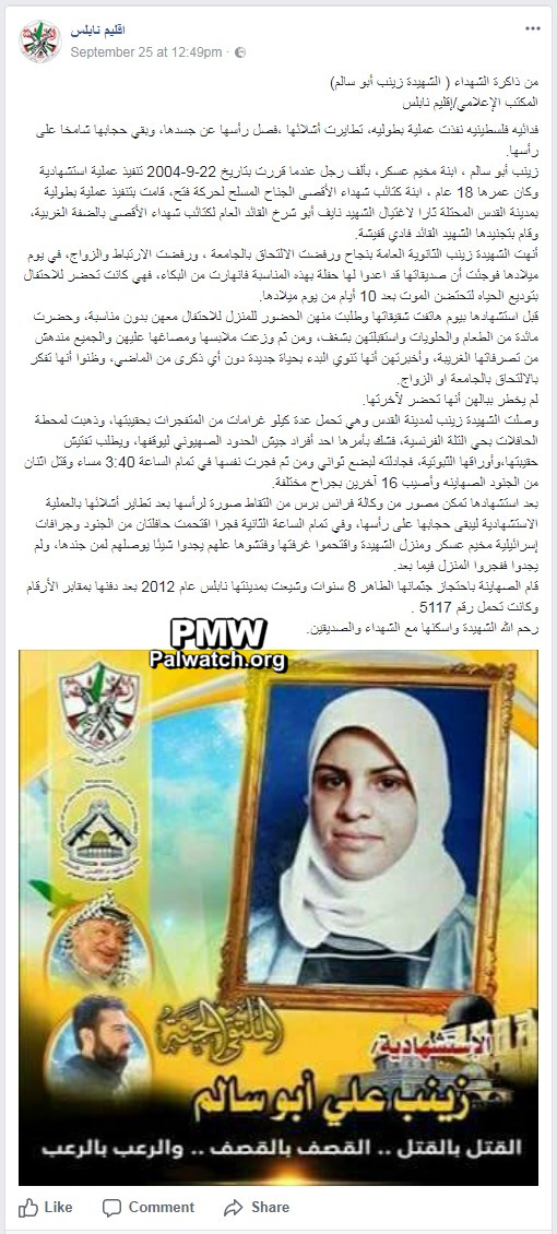 Posted text: “From the memory of the Martyrs (Shahids) – Martyr Zainab Abu Salem (i.e., suicide bomber, murdered 2)