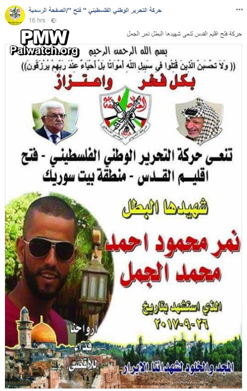 Posted text: “The Fatah Movement – Jerusalem Branch announces the death of its heroic Martyr (Shahid) Nimr Ahmed Al-Jamal (i.e., terrorist, murdered 3).”