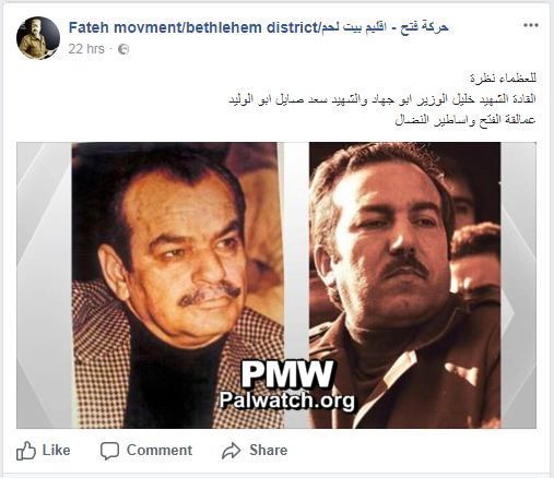 Martyr leaders Khalil Al-Wazir ‘Abu Jihad’ (i.e., terrorist, responsible for murder of 125) and Martyr Saad Sayel ‘Abu Al-Walid’ (i.e., senior Fatah terror commander)