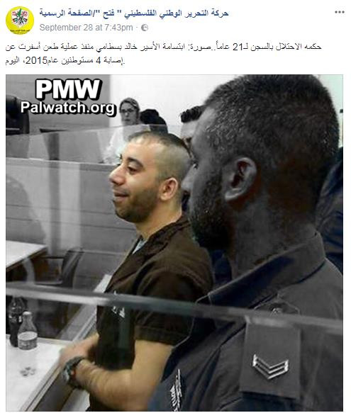 Posted text: “The occupation sentenced him to 21 years. In the picture: The smile of prisoner Khaled Bastami (i.e., terrorist, wounded 4) – who carried out a stabbing operation that caused the wounding of 4 settlers (the attack took place in the coastal town of Ra’anana –Ed.) in 2015 – today [Sept. 28, 2017].”