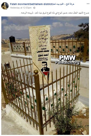 The image shows a monument to terrorist Muhammad Tanouh, which is in the shape of the PA map of “Palestine” that presents all of Israel as “Palestine” together with the PA areas. At the bottom of the monument is a picture of terrorist Tanouh and a Palestinian flag. Text on monument: “In the name of all merciful Allah, ‘And never think of those who have been killed in the cause of Allah as dead. Rather, they are alive with their Lord, receiving provision’ [Quran, Sura 3:169, Sahih International translation] Martyr Muhammad Hussein Ahmed Tanouh Date of his death as a Martyr: July 20, 2017” Muhammad Tanouh – Palestinian terrorist who attempted to stab Israeli soldiers at the entrance to the village of Taqua, south of Bethlehem, on July 20, 2017, and was shot and killed by them.