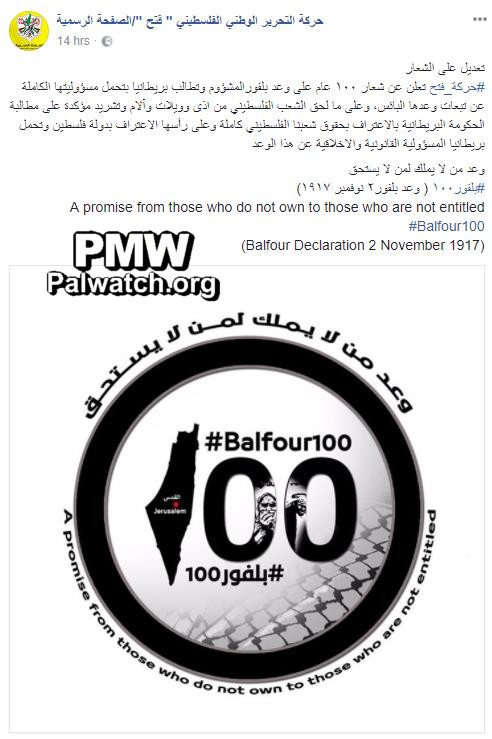 Fatah: “Britain [must] take full responsibility for the consequences of the wretched promise” (i.e., Balfour Declaration)
