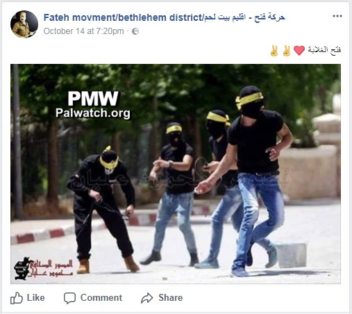The image shows four masked Palestinians wearing Fatah headbands and throwing rocks.