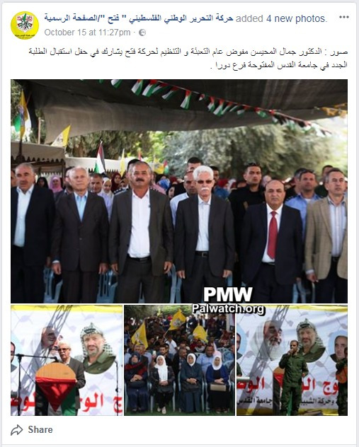 Identical images and text posted on the official Fatah Facebook page on Oct. 15, 2017, and on the Facebook page of Fatah Central Committee member Jamal Muhaisen on Oct. 16, 2017Posted text: "Pictures: Fatah Movement General Commissioner of Mobilization and Organization [in the West Bank and Fatah Central Committee member] Dr. Jamal Muhaisen participates in a reception for the new students at Al-Quds Open University’s Dura branch.”