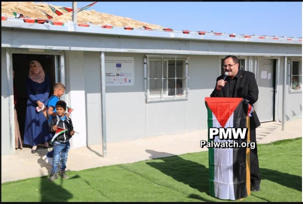 In the picture accompanying the article the symbol of the European Union can be seen on a sign on the front of the school building. PA Minister of Education Sabri Saidam is seen giving a speech in the picture, at a podium draped with the Palestinian flag.