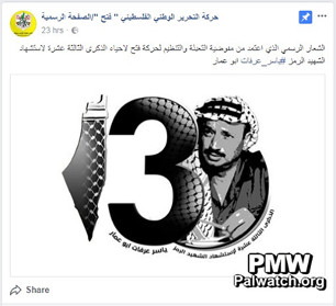 The image consists of the logo for the 13th anniversary of PLO and PA Chairman Yasser Arafat’s death, which includes a picture of Arafat and the number “13,” with the “1” comprised of the PA map of “Palestine” that presents all of Israel as “Palestine” together with the PA areas.
