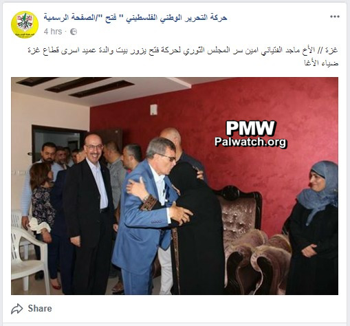 Posted text: “Gaza – Fatah Movement Revolutionary Council Secretary Majed Al-Fatiani visits the home of the mother of the Gaza Strip’s most veteran prisoner Diya Al-Agha (i.e., terrorist, murdered 1).”