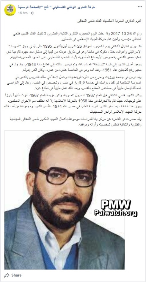 Headline: “22 years since the death as a Martyr of commander Fathi Shaqaqi”“Today, Thursday [Oct. 26, 2017], is the 23rd anniversary of the assassination of commander Martyr (Shahid) Fathi Shaqaqi, founder and secretary-general of the Islamic Jihad Movement in Palestine (i.e., terrorist organization).